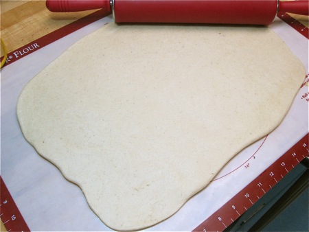 Gently deflate the risen dough, and roll it into a 12" x 18" rectangle.