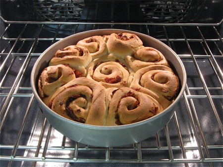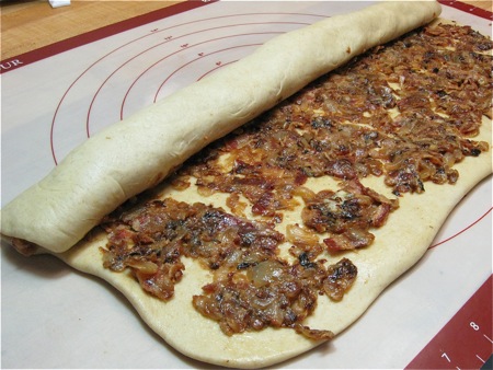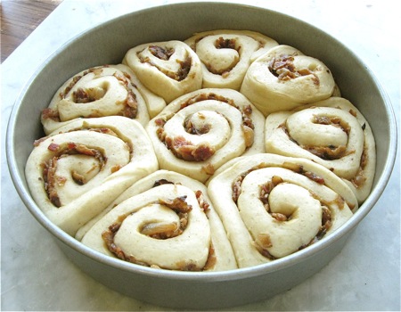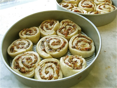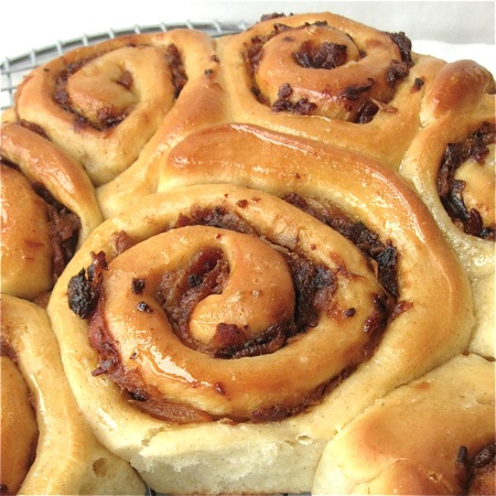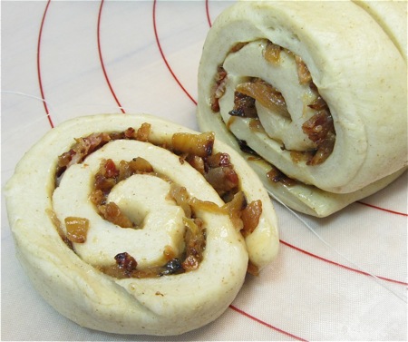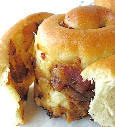 A breakfast where I wouldn't have been at all surprised to spot these rolls. Made with rye flour, stuffed with golden sautéed onions and crisp bacon, they're the perfect accompaniment to scrambled eggs or an omelet.
