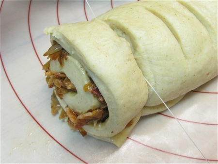 I'm using dental floss as a cutting tool here, to preserve my silicone rolling mat. Simply loop the floss around the log, cross the ends, then pull – works like a charm! Floss slides nicely through the filling and dough without squashing anything, like a knife would.