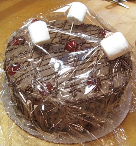 Thanks to my fellow test kitchen baker and Baking Sheet editor, Susan Reid, I now know how to keep plastic wrap from sticking to the top of a decorated cake – should I ever feel the urge to create such a cake.