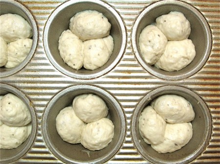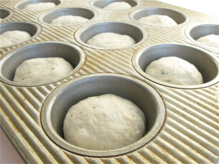 Into a lightly greased standard muffin pan go the 12 rounds of dough.