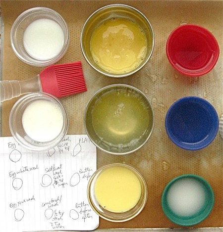 Verdict: color-wise, only a beaten whole egg makes a significantly different (darker) crust. The rest, the difference is so small as to be unappreciable.
