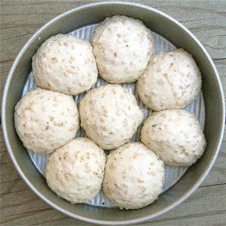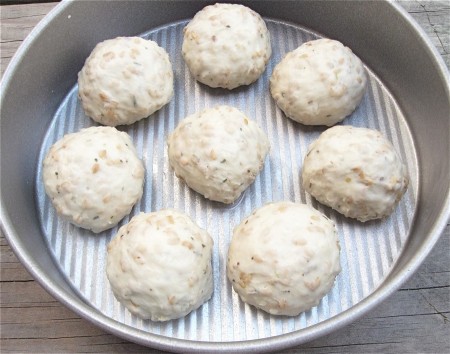 Divide the dough into 16 pieces. Place 8 pieces in each of two lightly greased 8" round cake pans.