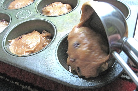 Spoon the batter into the prepared muffin cups. A level (to slightly heaped) muffin scoop of batter for each muffin works well here.