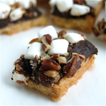 So, class, what do I name these vanilla shortbread bars topped with chocolate ganache, toasted pecans, and mini marshmallows?