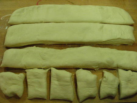 Pat the dough out to a rough rectangle, about 1/2" thick. Cut into 4 long strips, then cut each strip into 6 small squares. Voilà, 24 buns in the making.