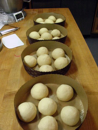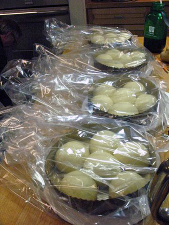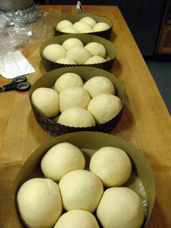 Roll your dough into 24 buns and pan up the way that works best for you. Here I've used 4 bake and give pans, with 6 buns each.