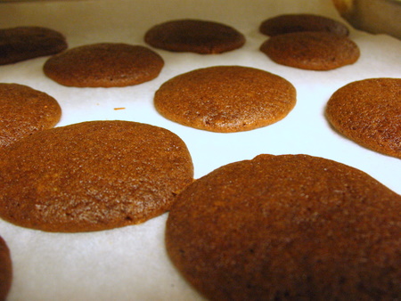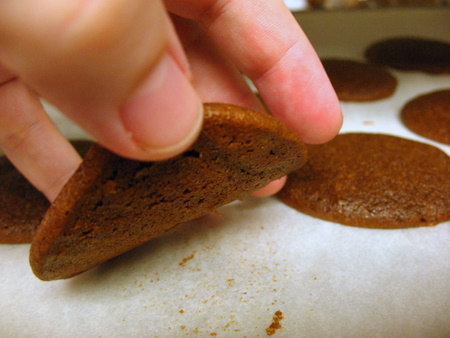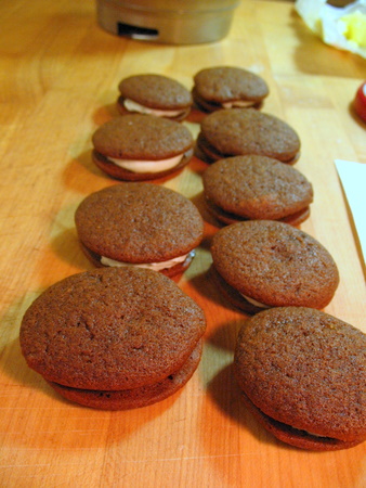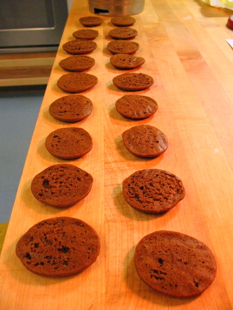 You'll notice that this pan of whoopies isn't very puffy. In a room full of ovens, it pays to make sure you're using the one set at 375°F, not the one set at 350°F. You just don't get that poofy, puffy texture when the oven is too cool.
