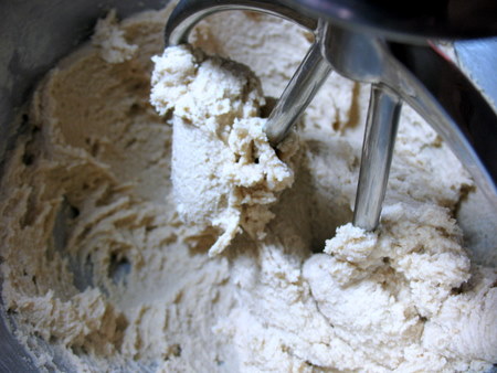 Mix the butter and half of the mix together until creamy, then add the egg white and beat until fluffy. Scrape down the bowl well.