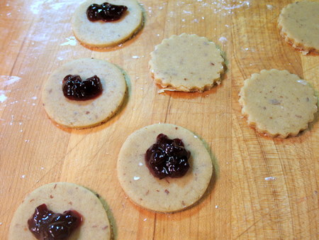 First up on my toppings and fillings list is red raspberry jam. Place 1/2 teaspoon of jam in the center of one of the cookies, and top with a second cookie. I used plain rounds for the bottom, and scalloped rounds for the top.