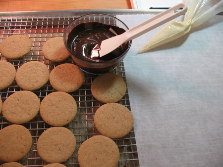 Dipping and piping with chocolate really allows you to make so many different styles of cookie, you can let your imagination run free. Because I didn't need tempered chocolate for dipping, I slowly melted 6 ounces of dark chocolate in a double boiler. For the white chocolate, I melted about 1 ounce in a disposable piping bag in the microwave.