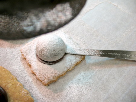 You'll need to move the spoon part way through sifting so that you don't have a handle line on the cookie base. You can see two slight impressions where the handle was on this particular cookie.