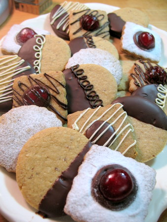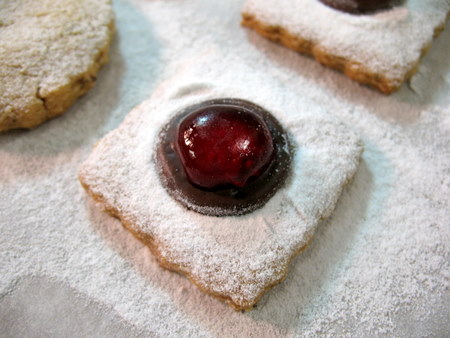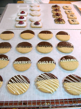 In the background you can see the fancier cookies with candied cherries set into the melted disks, the jam-filled cookies covered in white sugar and more candied cherries, drizzled with dark chocolate.