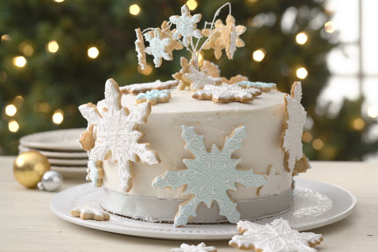 A few more sprinkles of glitter, a few more cookies placed nearby, and you're ready to present your snowflake fantasy cake. Imagine this as the centerpiece for your holiday dinner, or heading up the dessert section of your buffet.
