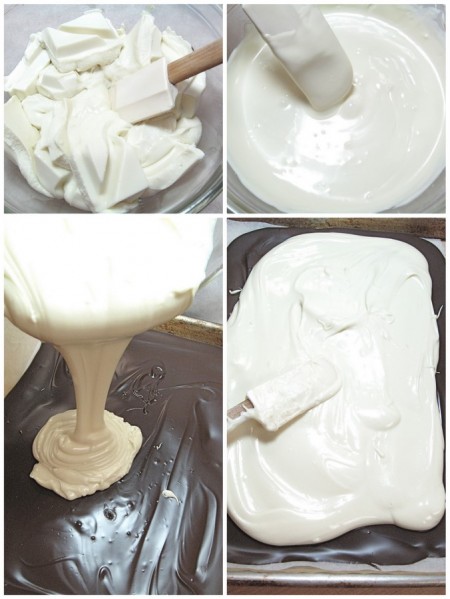 Pour and spread the white chocolate over the dark chocolate.