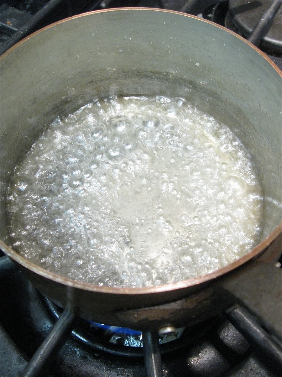 Set the saucepan over medium heat. Bring the mixture to a boil, and boil, swirling the liquid in the pan, until the sugar dissolves. Remove from the heat.