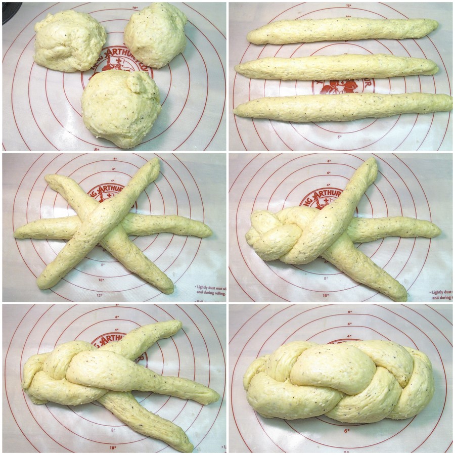 So, start in the center, and braid out to one end. Flip the entire loaf over, so the top is now the bottom, and the bottom the top; and braid out to the other end.