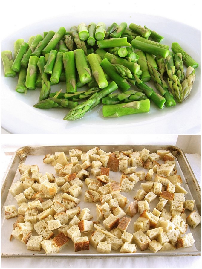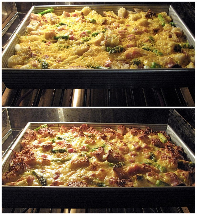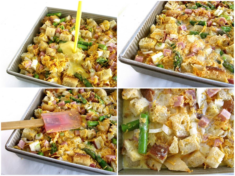 Put the bread cubes in a large bowl. Toss with 1/2 pound (227g) ham, diced; the asparagus; and 1 1/2 cups (170g) shredded cheddar cheese.