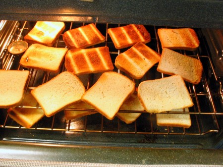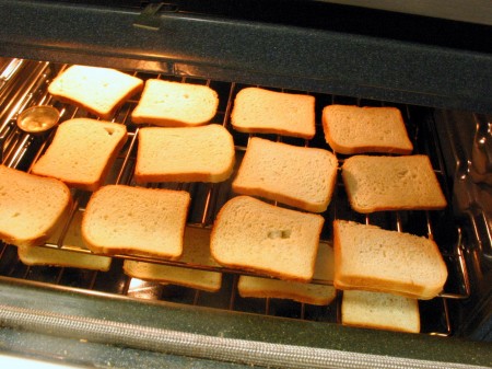 Turn the toast and move pieces about the oven as they brown up. Remove the finished pieces as they are done and continue to bake until all of the pieces are golden brown and ready to go.