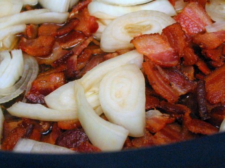 The onions will brown up and cook down, the bacon will soften slightly and the liquid will have cooked down.
