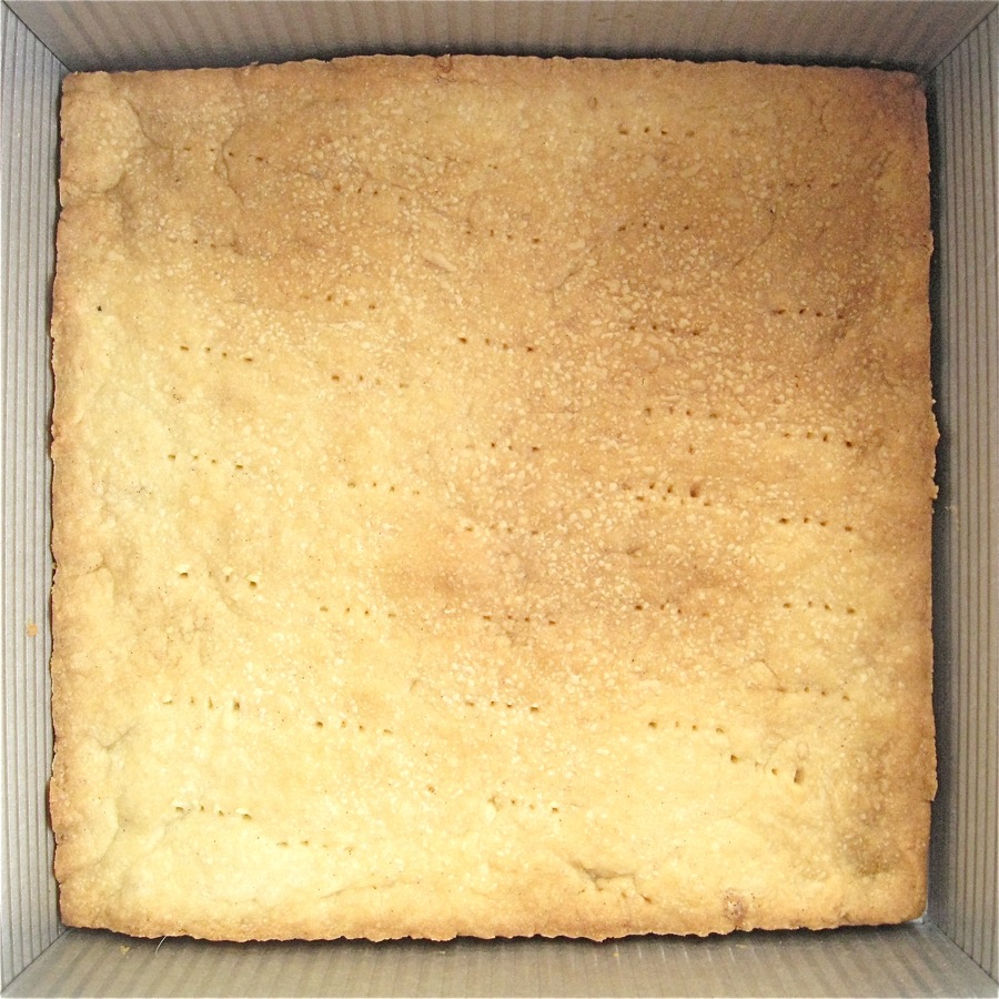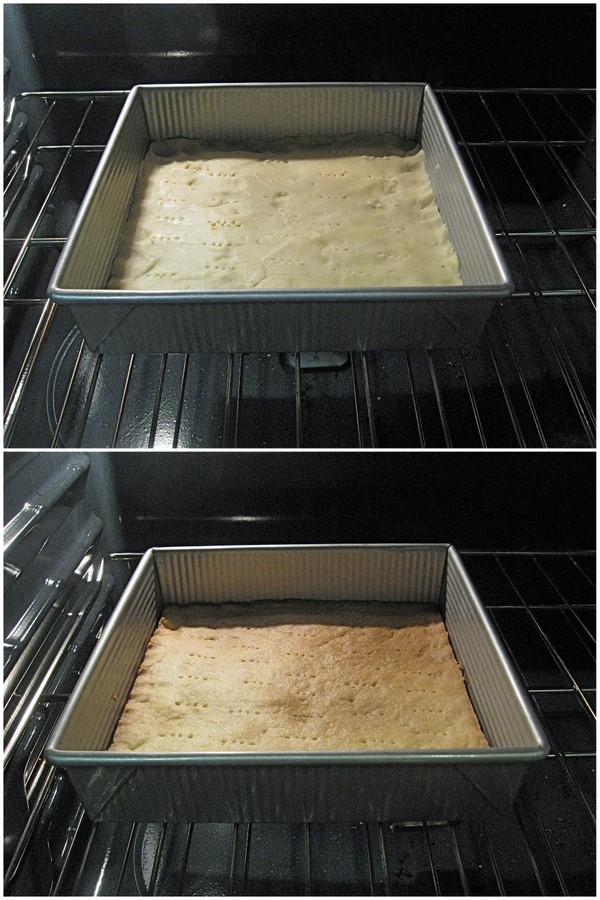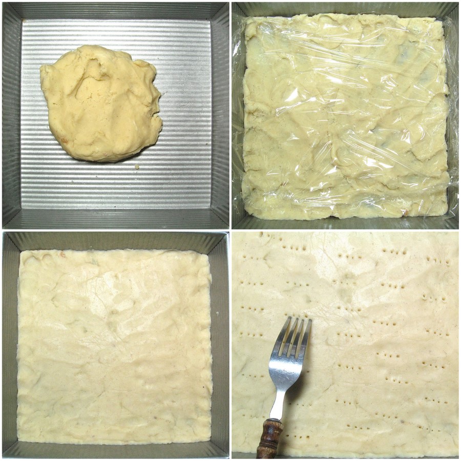 Pat the dough into the bottom of the prepared pan. For ease in flattening it out, lay a piece of parchment or plastic wrap over the dough, and press it with the flat bottom of a measuring cup. Or, if you have a small pastry roller, this is the place to use it.
