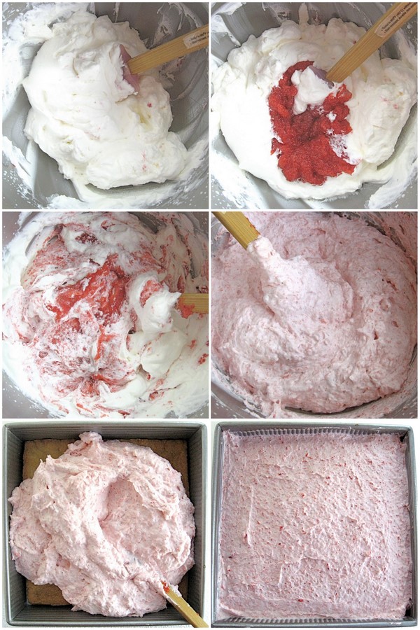 Whip 2 cups (1 pint, 16 ounces, 454g) heavy cream until stiff. Fold in the strawberry purée gently but thoroughly. Spoon the filling over the crust in the pan, smoothing the top.