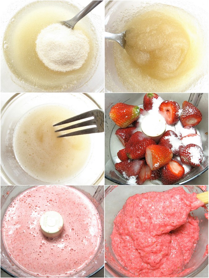 Hull the strawberries, but don't bother slicing them. Place them in a food processor or blender along with 2 tablespoons (28g) freshly squeezed lemon juice and 3/4 to 1 cup (149g to 198g) granulated sugar. Add the liquefied gelatin. Process until the berries are puréed.