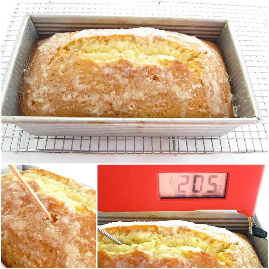 Remove the cake from the oven, and set it on a rack. Insert a toothpick into the center; it should come out clean. If you use an instant-read thermometer, the center should register about 200°F to 205°F.