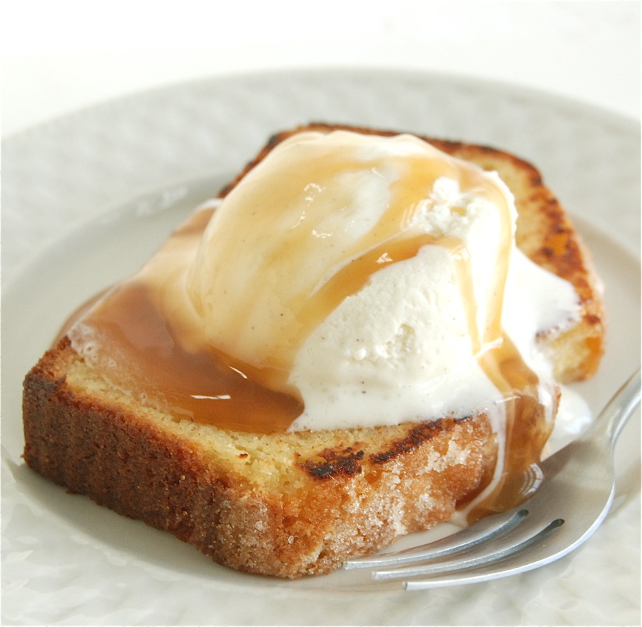 Butter a thick slice of cake, grill briefly, and enjoy as a base for ice cream (and caramel sauce, or strawberries, or butterscotch...)