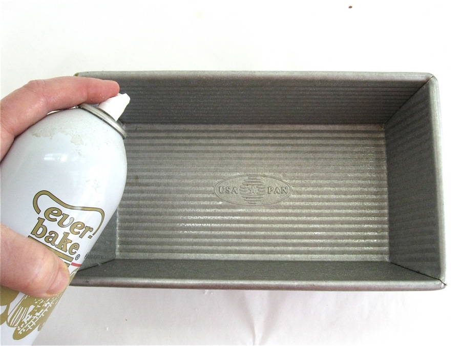 Spray your 9” x 5” x 2 3/4” loaf pan (or stoneware 12” x 4” x 4” tea loaf pan) with baking spray.
