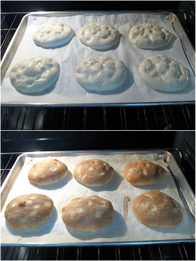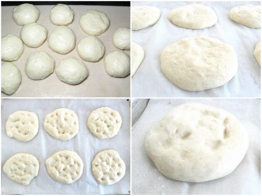 Turn the dough out of the bowl onto the lightly greased work surface. Divide it into 12 pieces, about 80g (2 1/4 ounces) each. Round each into a ball. Gently stretch the balls into flattened disks, about 3 1/2" wide, and place them on the prepared baking sheets, six to a sheet.