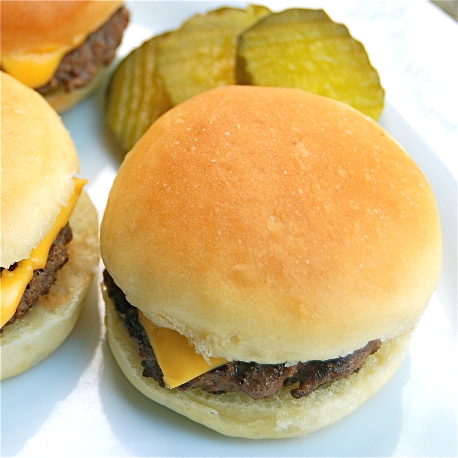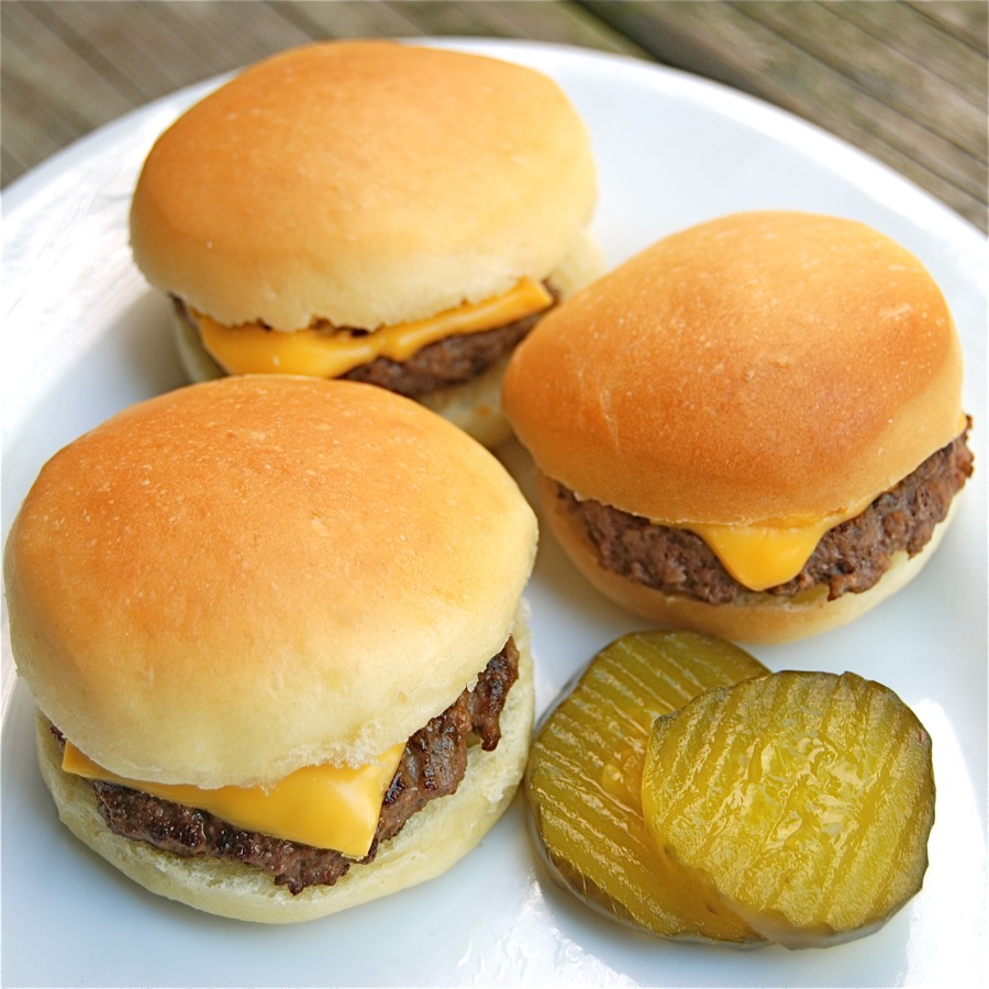 I'm here to show you a relatively easy way to make tiny buns, using your favorite homemade roll recipe. Add 1 1/2-ounce hamburger patties, American cheese, a pickle slice, and steam-fried onions, and you have the classic slider.