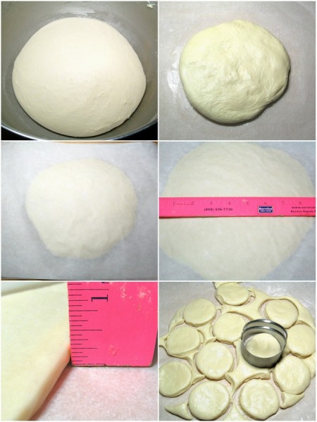 Pat and roll the dough to a 9"-diameter circle, about 3/8" thick. Then use a 2" round biscuit cutter to cut circles from the dough, cutting close together to leave as few scraps as possible.