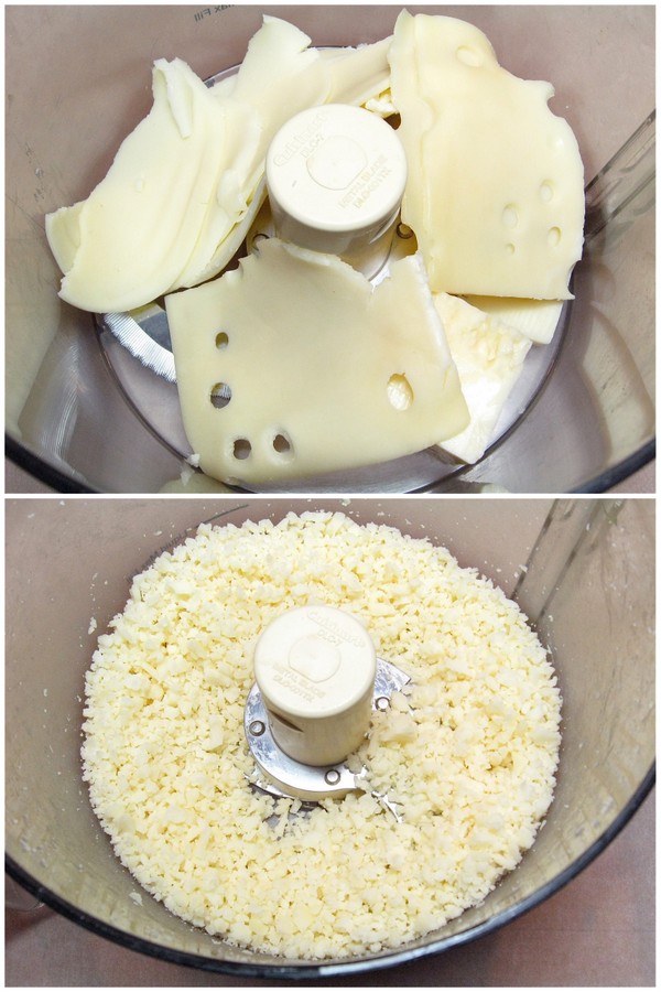 First, let's mimic the special cheese you'd find in a real St. Louis pizza: Provel, a low melting-point, processed cheese that's a combination of smoked Provolone, cheddar, and Swiss
