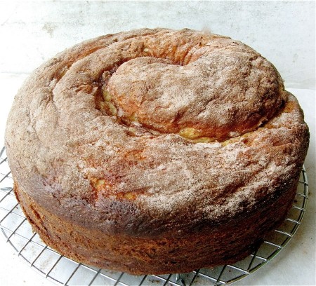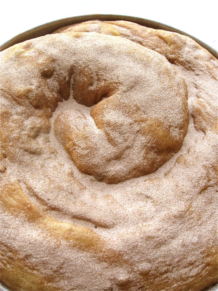 Starting with the tapered end, coil the rope loosely into a lightly greased 9" round cake pan, starting at the center and working outwards. Scrape any extra cinnamon-sugar off the counter, and sprinkle it atop the coiled dough.