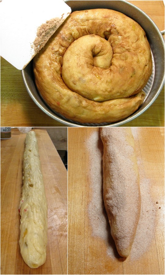 Pat and roll the dough into a 36" rope, tapering one end. Poke any raisins or apple bits sticking out of the dough back underneath the dough's surface; this will help prevent them from burning in the oven.