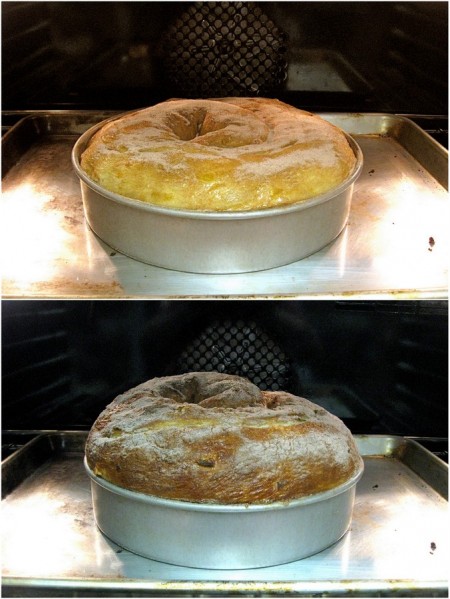 Place the cake pan atop a baking sheet; this will insulate the bread's bottom crust, and keep it from browning too much.