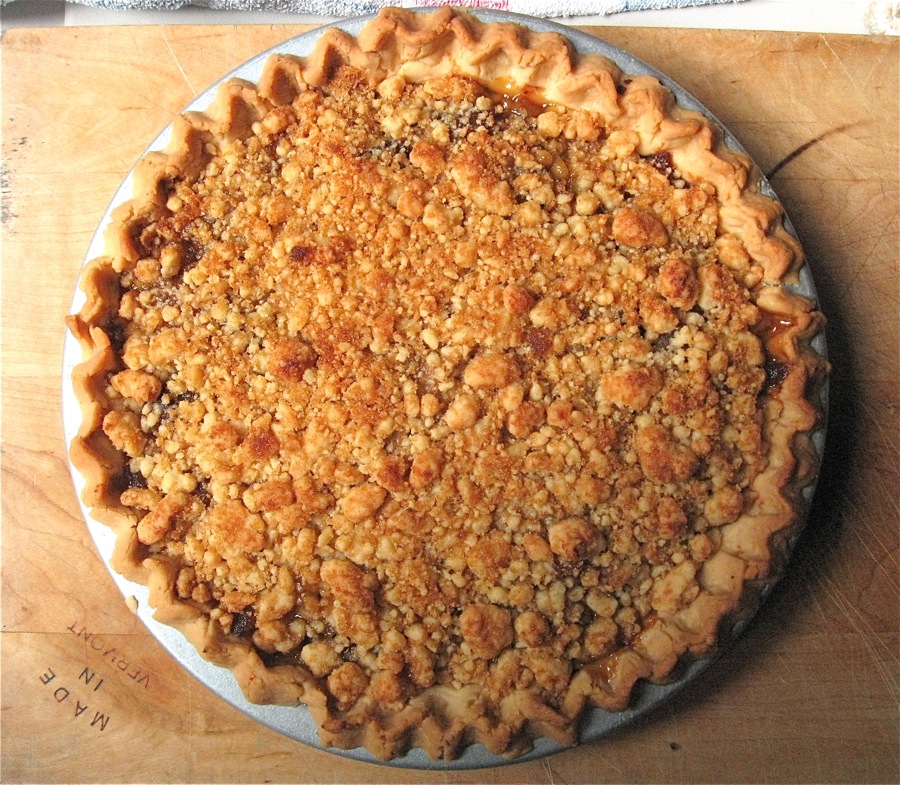 Remove the pie from the oven. Both crust and crumb topping should be golden brown.