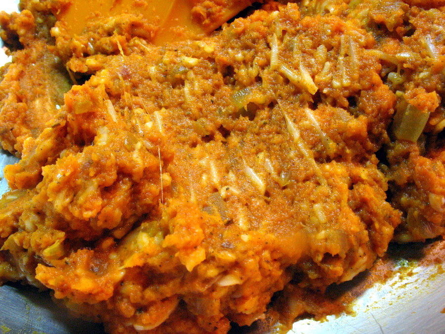 Add the drained pumpkin. See how thick it is now? You'll notice, too, there's no liquid pooled around it in the pan. Just right!