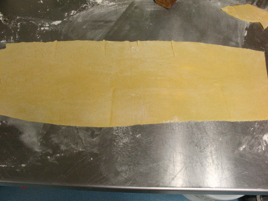 Roll out sheets of pasta on the next to thinnest setting of your pasta machine. Remember, a ravioli is made of two layers of pasta, and if they're too thick you'll end up with heavy, chunky ravioli.