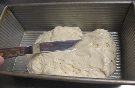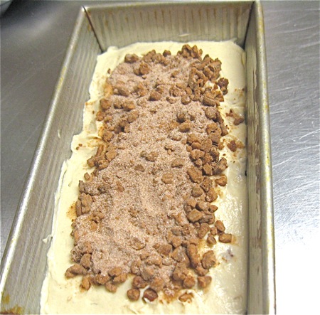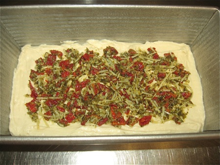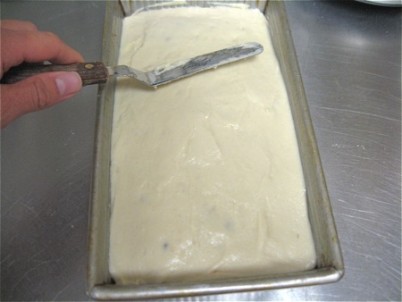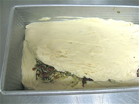 Begin the layering process by spreading about 1 1/4 cups batter in the bottom of a 9" x 5" loaf pan.