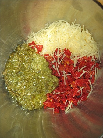 For the pesto filling, combine 3/4 cup sun-dried tomatoes, 1/2 cup pesto, and 1/2 cup Parmesan cheese.