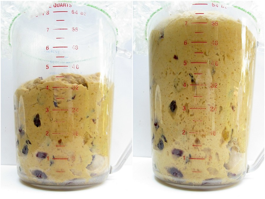 When the dough is almost fully kneaded, add 3/4 cup (128g) dried cranberries or golden raisins, and 1/4 cup (46g)diced crystallized ginger. Knead until evenly distributed throughout the dough.