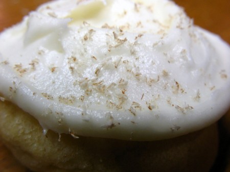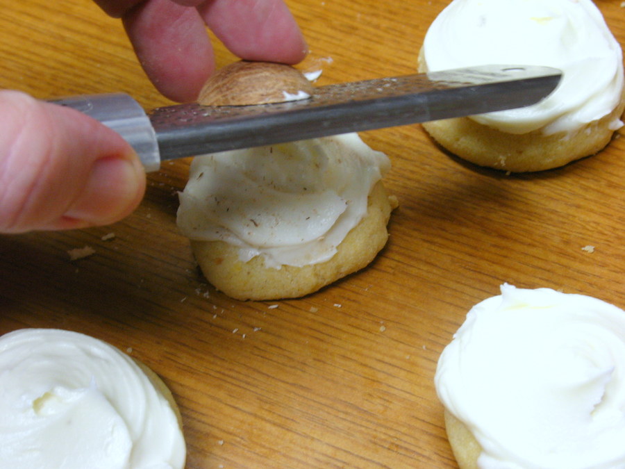 Ice each cookie with a generous swirl of frosting and top with a dash of nutmeg. I like to use my microplane grater for this. Zip, zip, zip.