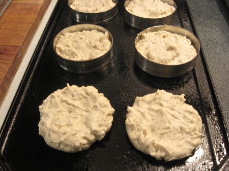 When the griddle is hot, divide the batter among the rings and wait for the muffins' bottoms to set before carefully removing the rings.