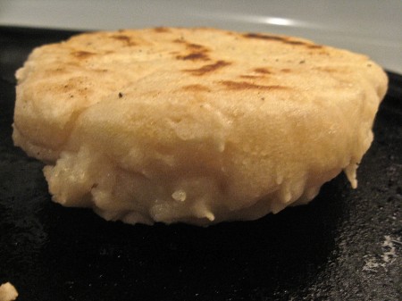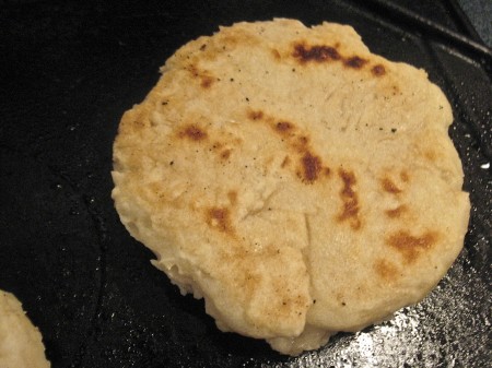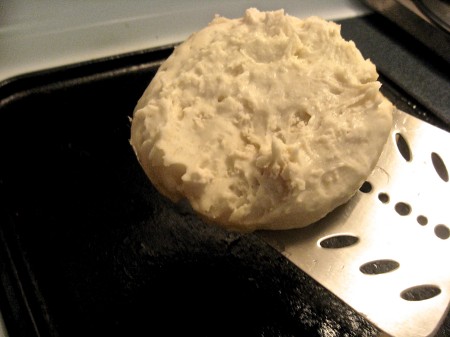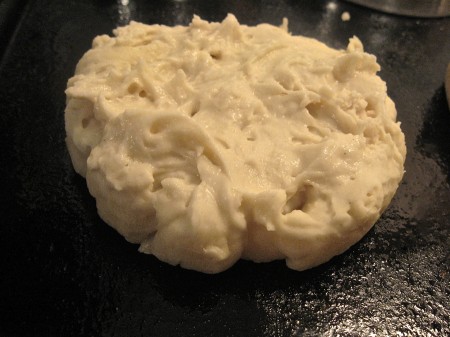 You can sprinkle the surface of the griddle inside the rings with cornmeal if desired, to help prevent sticking. I made mine without to make sure it wasn't necessary, but I'll be honest – it's nice to have the added texture of the cornmeal. Typically semolina would be used for wheat-based English muffins.