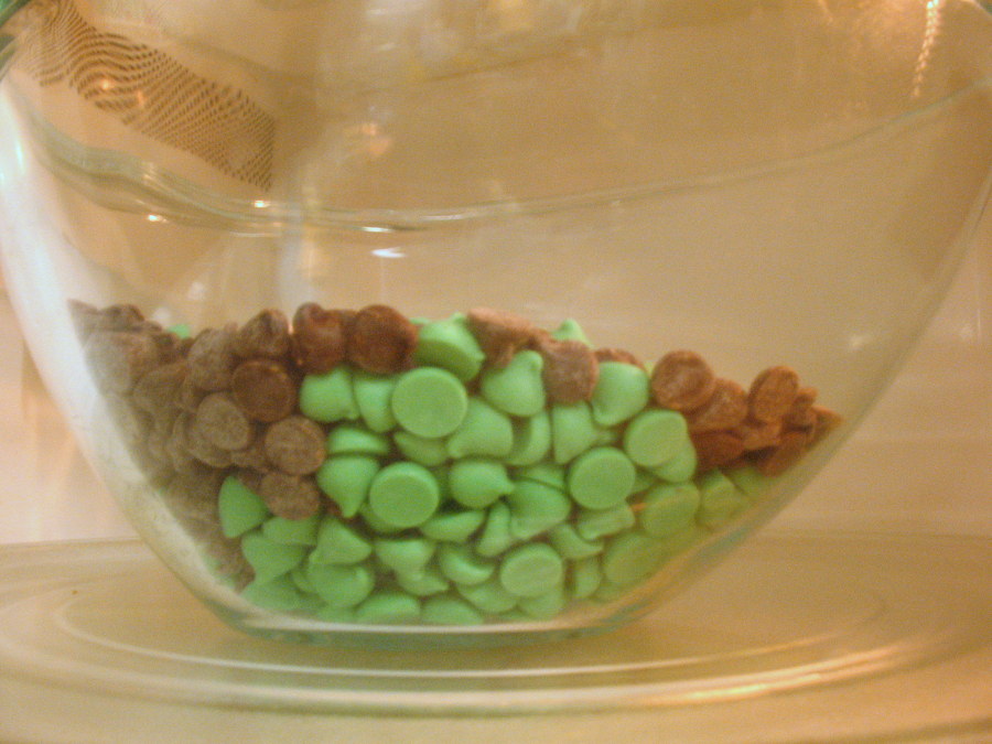 Place 2 cups of your chips of choice in a large microwave-safe bowl, and heat on high for 1 minute. Here I've used 1 cup of chocolate chips, and 1 cup of green mint chips from our local grocery store.
