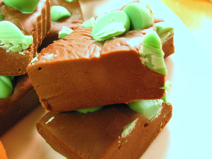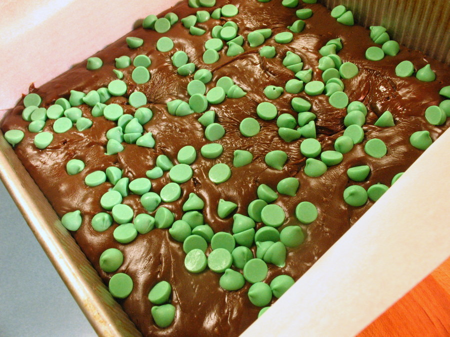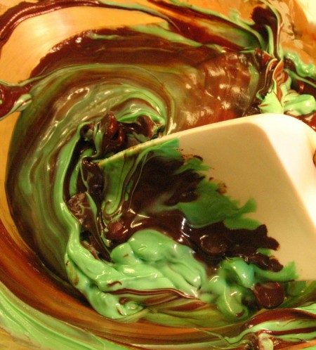 If desired, sprinkle additional toppings on. I love the look of green mint chips on dark fudge. Plus, it gives the taster an easy way to identify the flavor at a glance.