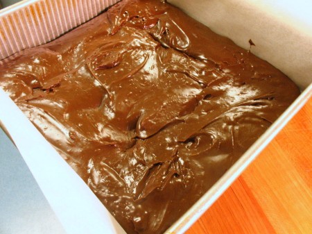 Pour/scrape the fudge into a parchment-lined 8" square pan, and gently spread to fill the pan evenly.