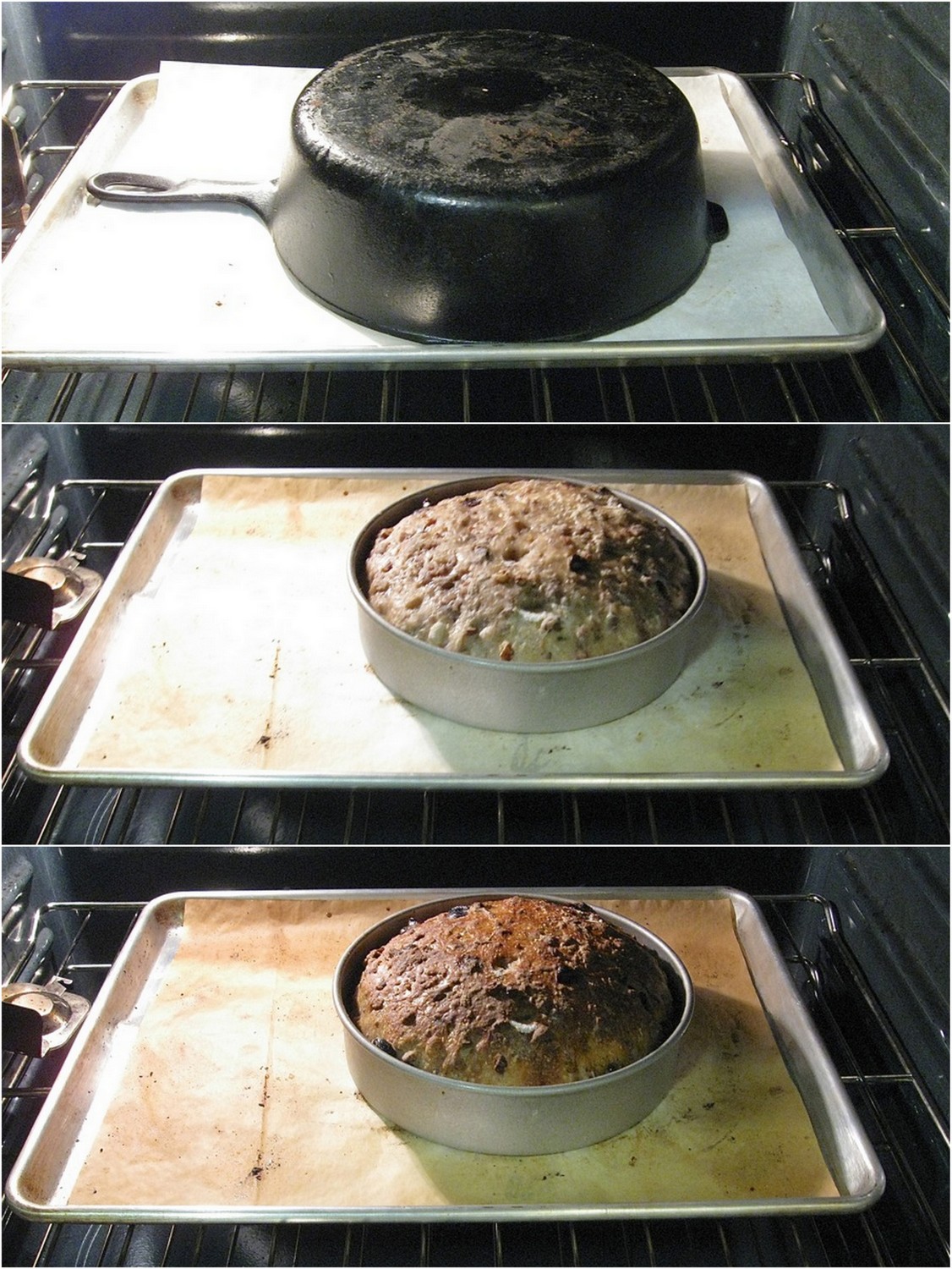 Towards the end of the rising time, preheat your oven to 450°F. If you're using a round cake pan, find a large oven-proof bowl, deep cast iron skillet, or something else that can serve as a cover for the bread. Keep in mind that it'll rise a bit, so make sure your cover is tall enough.